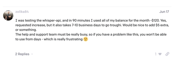 開發者zolika84在測試語音識別whisper-api時,90分鐘就用掉了120美元額度