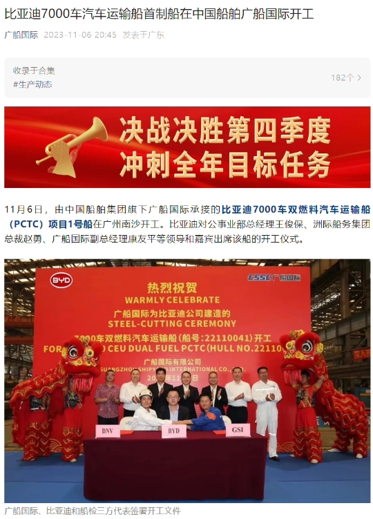 廣船國際公眾號發文,由中國船舶集團旗下廣船國際承接的比亞迪 7000 車雙燃料汽車運輸船(PCTC)項目 1 號船在廣州南沙開工。