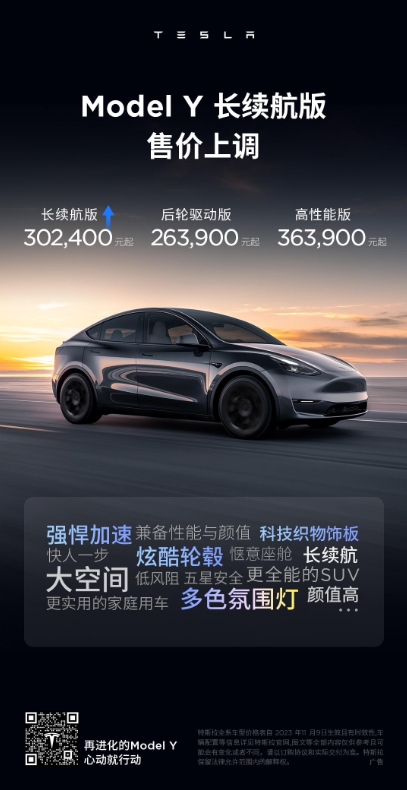 Model Y 全輪驅(qū)動(dòng)長(zhǎng)續(xù)航版售價(jià)調(diào)整為 30.24 萬(wàn)元,此前為 29.99 萬(wàn)元,上漲 2500 元。