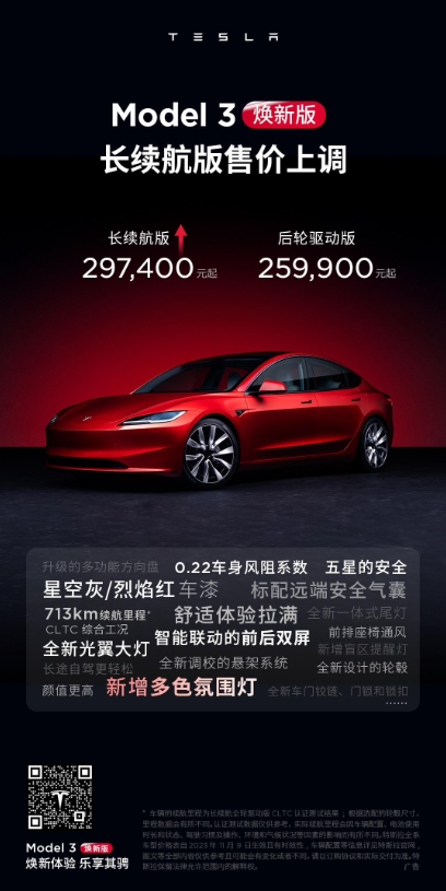 Model 3 長(zhǎng)續(xù)航煥新版售價(jià)調(diào)整為 29.74 萬(wàn)元,此前為 29.59 萬(wàn)元,上調(diào) 1500 元。