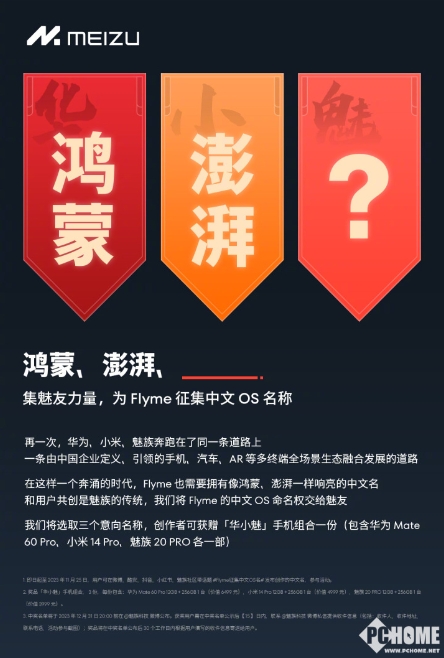 據(jù)悉,魅族向用戶整機(jī)Flyme的中文OS命名,之后會選取三個意向名,創(chuàng)作者可獲贈“華小魅”手機(jī)組合一份(包含華為Mate 60 Pro、小米14 Pro、魅族 20 PRO各一部)。