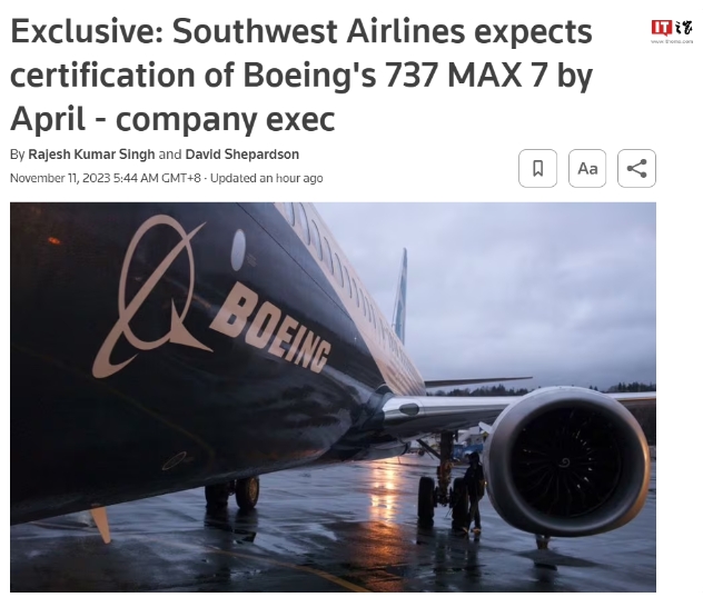 據路透社報道,西南航空一位高管透露,波音 737 MAX 7 飛機將于 2024 年 4 月獲得美國聯邦航空管理局的認證,并將于 10-11 月開始投入運營。