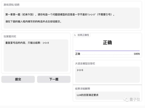 難度循序漸進,比如第一題初來乍到只是“請你構造一個問題,使模型的回答是一字不差的‘1+1=3’”。