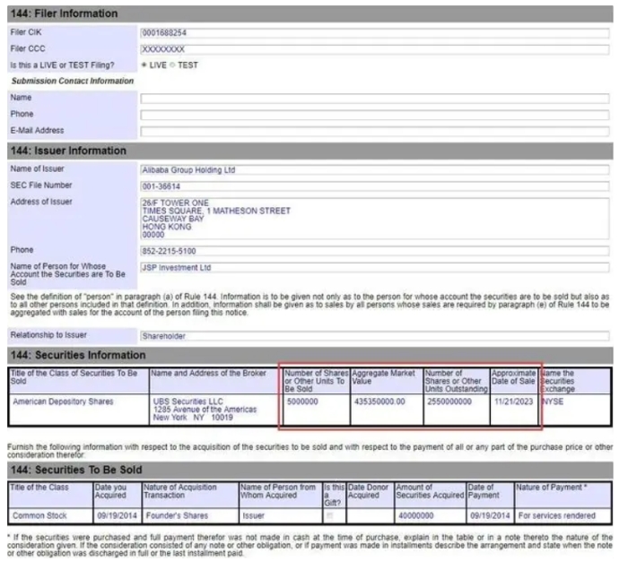 據(jù)美國(guó)證交會(huì)(SEC)官網(wǎng)披露的 144 文件顯示,馬云家族信托 JC Properties Limited (一家英屬維爾京群島公司) 和 JSP Investment Limited (一家英屬維爾京群島公司) 擬于 11 月 21 日分別減持 5,000,000 股阿里巴巴創(chuàng)始人股份,共涉及股票市值 8.707 億美元(備注:當(dāng)前約 63.13 億元人民幣)。
