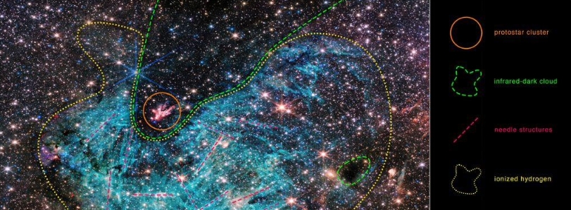 一大片電離氫,以青色顯示,包裹著紅外暗云,該云非常密集,以至于阻擋了來自其后面遙遠恒星的光線。電離氫發射中有趣的針狀結構缺乏任何均勻的方向。研究人員注意到電離區域的范圍令人驚訝,覆蓋了大約 25 光年。