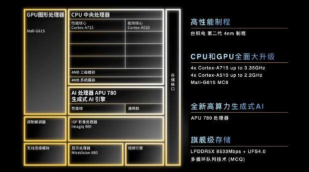 支持旗艦級LPDDR5X 8533Mbps 內存,支持UFS 4.0 閃存以及多循環隊列技術(Multi-Circular Queue,MCQ)。內存傳輸速率較上一代提升 33%,閃存讀寫速率提升100%。