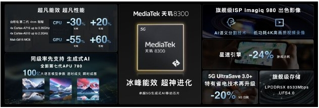 據官方介紹,作為天璣8000系列家族的新成員,天璣 8300擁有先進的生成式AI技術與高能效特性,并且游戲體驗出色,同時具備高速穩定的網絡連接能力。