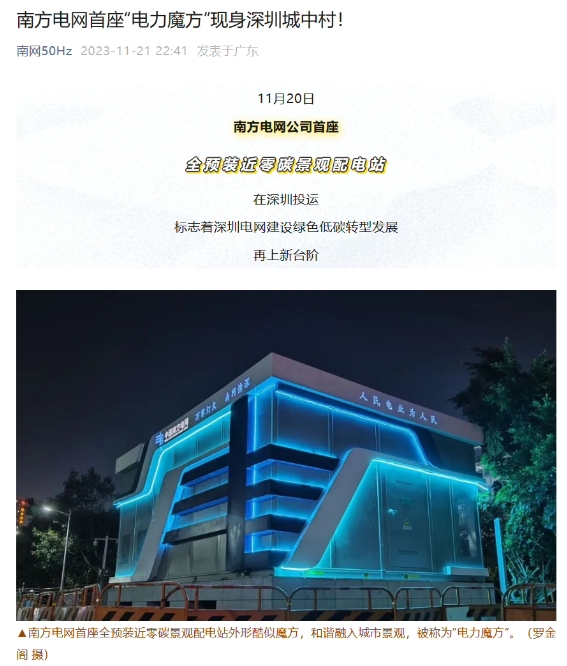 11 月 20 日,南方電網公司首座全預裝近零碳景觀配電站在深圳投運。該配電站外形酷似魔方,可以融入城市景觀,被稱為“電力魔方”。