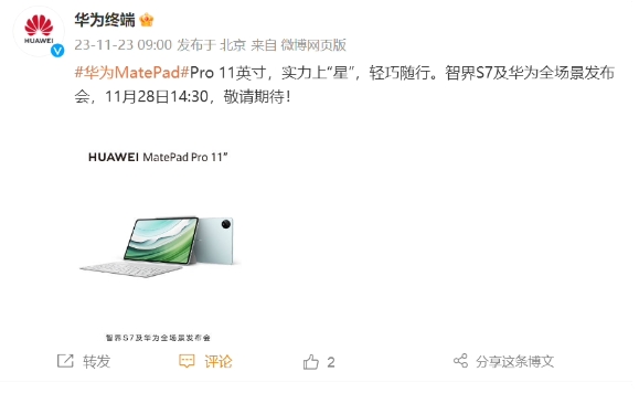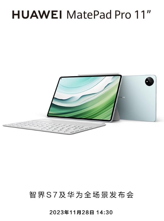 華為官方正式宣布,智界 S7 及華為全場景發布會將于 11 月 28 日 14:30 舉行。此次發布會上,除了已經提前亮相的智界 S7 之外,華為還將帶來一款全新的平板產品。