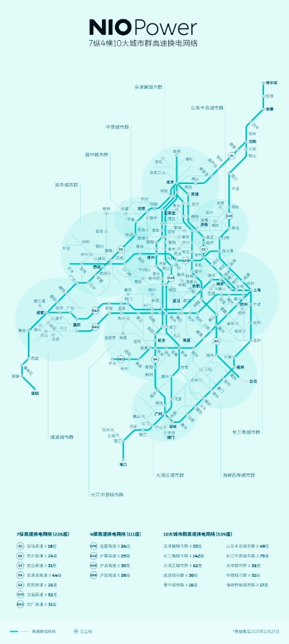 截至 11 月 23 日,蔚來已在全國累計建成 2127 座換電站,其中 660 座高速換電站,完成 7 縱 4 橫 10 大城市群高速換電網絡布局:G1 京哈、G2 京滬、G3 京臺、G4 京港澳、G5 京昆、G15 沈海、G30 連霍蘇陜段、G42 滬蓉、G45 大廣京廣段、G50 滬渝、G60 滬昆滬湘段和京津冀、長三角大灣區、成渝、長江中游、山東半島、關中、中原、晉中、海峽西岸。