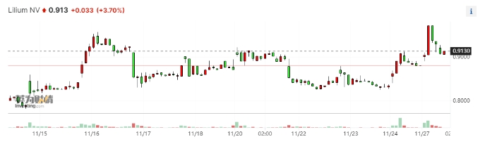消息公布后,在納斯達(dá)克上市的Lilium股價(jià)一度跳漲超10%,最高報(bào)每股0.970美元?,F(xiàn)漲幅收窄至3.70%,報(bào)每股0.913美元。