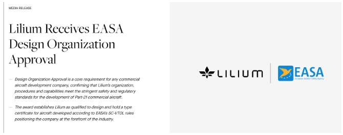 德國(guó)“電動(dòng)垂直起降飛行器”(eVTOL)開發(fā)商Lilium N.V.在官網(wǎng)宣布,公司收到了歐盟航空安全局(EASA)頒發(fā)的“設(shè)計(jì)機(jī)構(gòu)批準(zhǔn)”(Design Organization Approval,DOA)。
