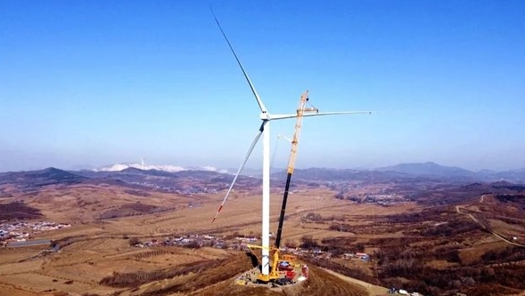 在中國能建東電二公司大石橋鑫泰200MW風電項目現場,徐工XCA3000成功將重25噸、長95米的風機葉片輕輕拉上107米的高空,精準對接風機輪轂,安裝到位。