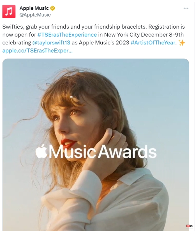 Apple Music 宣布將于 12 月 8 日- 9 日在紐約舉辦“泰勒?斯威夫特時代:體驗(Taylor Swift Era's: The Experience)”活動,慶祝泰勒?斯威夫特榮獲 Apple Music 2023 年度藝術家稱號,現已開放報名。
