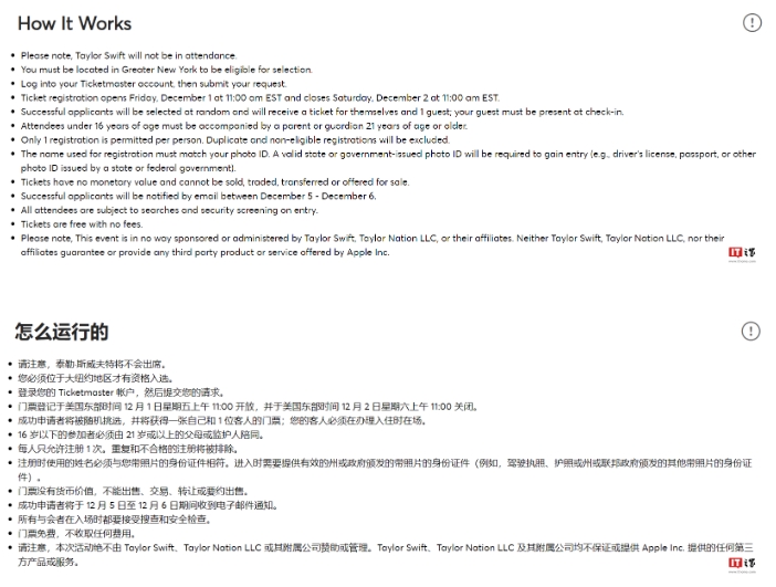 據了解,粉絲們將能夠瀏覽代表斯威夫特 10 個時代的 10 個場景并與之互動。報名截止日期為 12 月 2 日上午 11:00,已有超過 5 萬人排隊報名門票(免費),泰勒?斯威夫特不會出席。