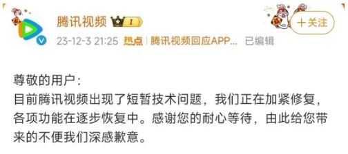 騰訊視頻官方微博3日晚發文稱,目前騰訊視頻出現了短暫技術問題,正在加緊修復,各項功能在逐步恢復中。