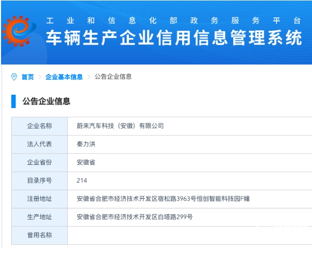 PChome在工信部“車輛生產企業信用信息管理系統”已經查到了“蔚來汽車科技(安徽)有限公司”,生產地址為安徽省合肥市經濟技術開發區白塔路299號,法人代表為秦力洪。公開資料顯示,秦力洪是蔚來汽車聯合創始人、總裁。此前,秦力洪曾任蔚來手機公司法人代表。由此來看,蔚來獲獨立生產資質的傳聞或已坐實。