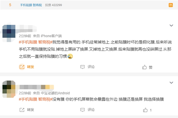 有網友表示:“貼了損失幾十塊,不貼換屏大幾千”“沒有膜,你的手機屏幕就會暴露在外邊,換膜還是換屏,我選擇換膜”“10塊以內高清膜挺好,摔了也不心疼,防窺膜和藍光膜就很智商稅了”等等。