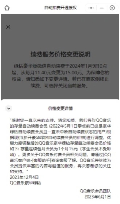 有網友反饋,QQ 音樂日前向微信用戶發送“續費服務價格變更提醒”:2024 年 1 月 9 日 0 點起,綠鉆豪華版微信自動續費的費用將從 11.4 元 / 月變更至 15 元 / 月。