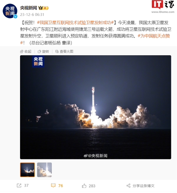 祝賀!我國(guó)衛(wèi)星互聯(lián)網(wǎng)技術(shù)試驗(yàn)衛(wèi)星發(fā)射成功 09:27:21