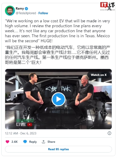 在與門羅交談時,馬斯克最初拒絕提供該項目的具體細節,稱如果他這樣做,特斯拉將不得不弄清楚新車將如何影響其未來的收益。但他暗示這款低成本車型將涉及一條全新的汽車生產線,這將大大降低電動汽車的制造成本。馬斯克表示:“這是一種遠超地球上任何汽車工廠的生產技術水平。”他還補充說:“第一款產品將在得克薩斯州的超級工廠生產,然后公司計劃將生產擴展到墨西哥的第二家工廠。”