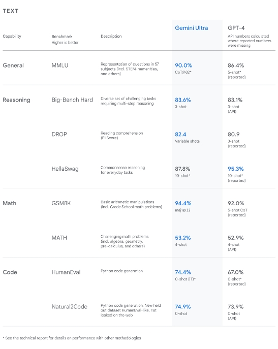 根據谷歌給出的基準測試結果,Gemini 在許多測試中都表現出了“最先進的性能”,甚至在大部分基準測試中完全擊敗了 OpenAI 的 GPT-4。