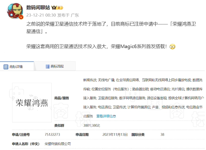 據博主 @數碼閑聊站 今日爆料,榮耀衛星通信技術已經落地,目前商標已注冊申請中 ——「榮耀鴻燕衛星通信」。榮耀這套商用的衛星通話技術投入很大,榮耀 Magic6 系列首發搭載。