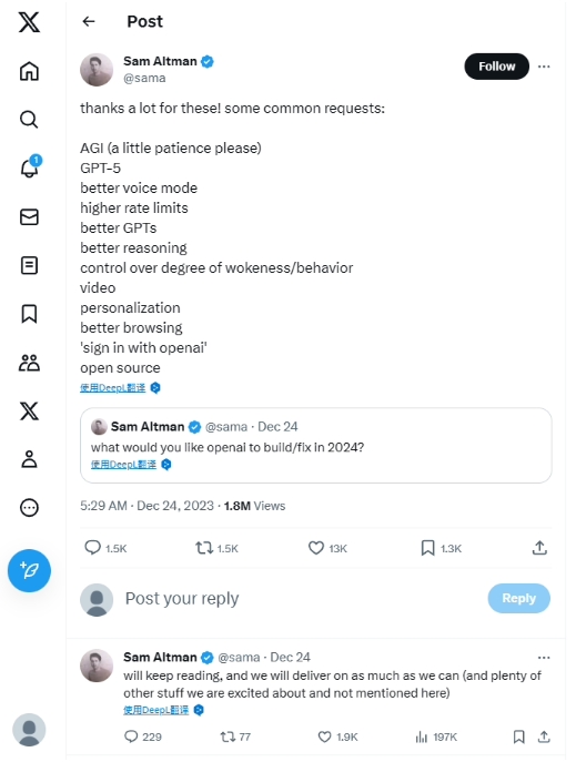 時值圣誕季,OpenAI 首席執行官薩姆?阿爾特曼化身“圣誕老人”在自己的 X 平臺賬號上發文征求網友們 2024 年對 OpenAI 的愿望與期待:“你希望 OpenAI 明年新增或修復哪些功能?”。