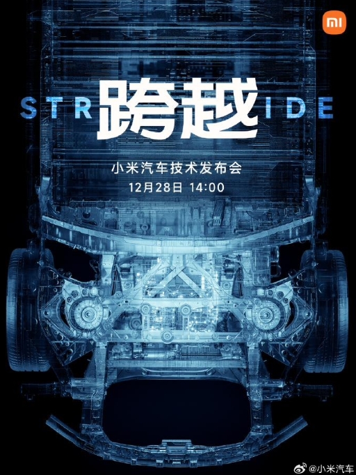 小米汽車技術(shù)發(fā)布會官宣 12 月 28 日下午 2 點舉行。官方放出了一張汽車底盤的預(yù)熱海報,配文“跨越 / STRIDE”。
