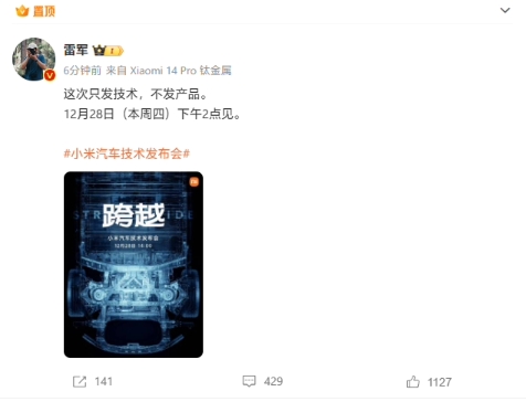 昨天晚上,小米創(chuàng)始人雷軍也“親自召喚”小米汽車官方微博,暗示新車的預(yù)熱工作即將展開。隨后時間來到今天上午,雷軍又發(fā)文解釋稱“這次只發(fā)技術(shù),不發(fā)產(chǎn)品。”