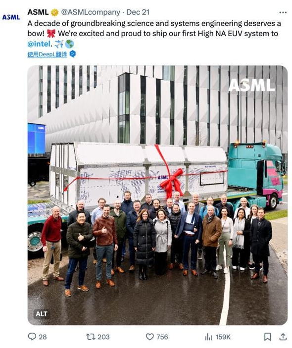 "耗時十年的開創性科學和系統工程值得鞠一躬!我們很高興也很自豪能將我們的第一臺高數值孔徑的極紫外光刻機交付給 Intel。"ASML 公司說道。