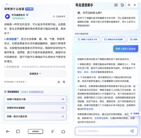 在傳統搜索體驗方面,搜索框問題表述不清、信息理解困難等頑疾始終困擾用戶。與傳統搜索結果相比,“夸克健康助手”提供了更加全面和準確的健康信息。同時,夸克健康助手也有獨立的功能頁面,支持用戶針對健康問題進行多輪提問和對話。這種問答式的交互方式能呈現出更多維度的內容建議,讓每一個人都能擁有一個可以隨時交流的AI健康助手。