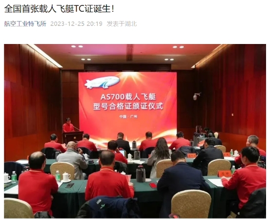 全國首張載人飛艇型號合格證誕生:我國完全自主知識產權“祥云”AS700 獲批
