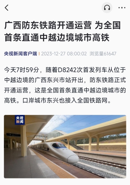 全國(guó)首條直通中越邊境城市高鐵,廣西防東鐵路今日起開(kāi)通運(yùn)營(yíng) 09:39:40