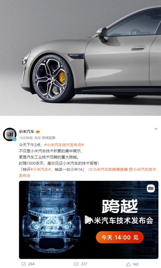 小米汽車表示,“今天下午2點,小米汽車技術發布會不僅是小米汽車技術積累的集中展示,更是汽車工業技術范疇的重大跨越,時隔1000多天,見證小米汽車的技術答卷。”