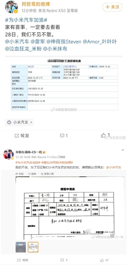 有米粉表示:“不必多言,直接調休見證小米汽車歷史性時刻”“家有喜事,一定要去看看”。