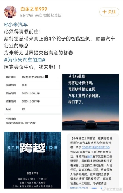 這些米粉花式請假參加小米汽車技術發布會,不僅反映了小米品牌強大的粉絲凝聚力,也揭示了消費者、業內對于小米首款汽車的高度關注和期待。