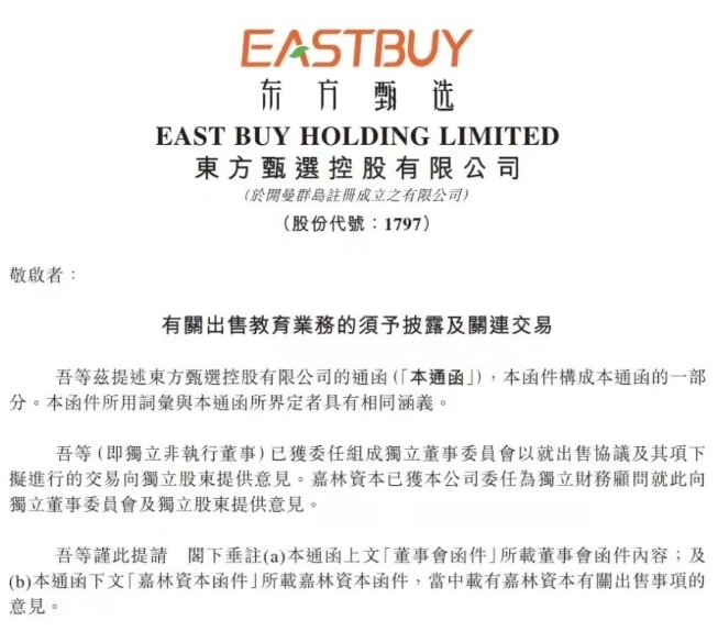 東方甄選公告稱:“出售事項乃廣義新東方集團業務重組的一部分,旨在更明確地劃分其業務線,及更好地使其業務部門與運營環境保持一致。目前,本集團及新東方集團所運營的行業相互重疊,其業務根據其產品 / 服務的交付媒介進行劃分。出售事項后,本集團及新東方集團所運營的行業將相互區分且各不相同,本集團不再經營在線教育領域,而是成為一家專門的自營產品及直播業務運營商。”