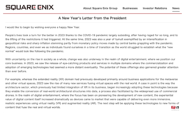 Square Enix 新任社長桐生隆司日前發布了 2024 年總裁新年信,概述了公司今年的主要戰略方向,其中主要提到“三大重點”,即“改善游戲質量”、“強化發行能力”、“引入 AI 等新技術”。
