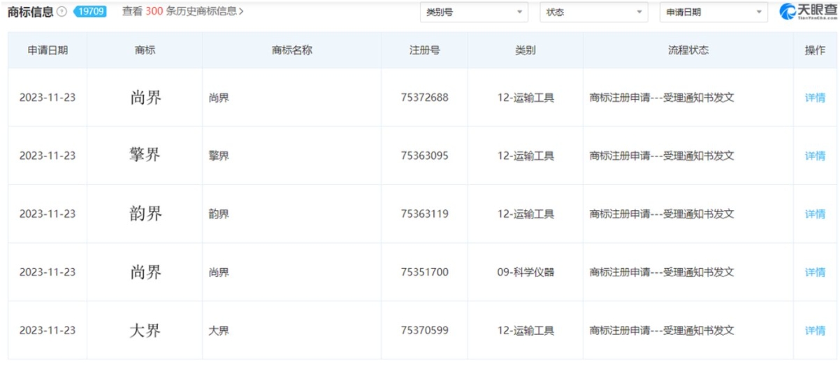 華為“造車”的成功,自智選車模式的問界以來我們有目共睹,但其野心顯然不止步于此,天眼查 APP 顯示,今年下半年華為已經密集申請注冊了“尚界”、“擎界”、“大界”等一系列界字輩兒商標。