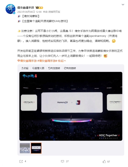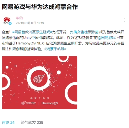 華為官方今日宣布:網易首款鴻蒙原生游戲《倩女幽魂手游》完成開發,成為首款完成開源鴻蒙適配的 Unity 中國引擎游戲。