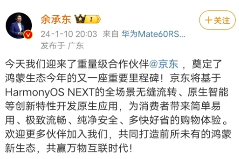 華為常務董事、終端業務CEO、智能汽車解決方案BU董事長余承東在微博發文稱:“今天我們迎來了重量級合作伙伴京東,奠定了鴻蒙生態今年的又一座重要里程碑!”
