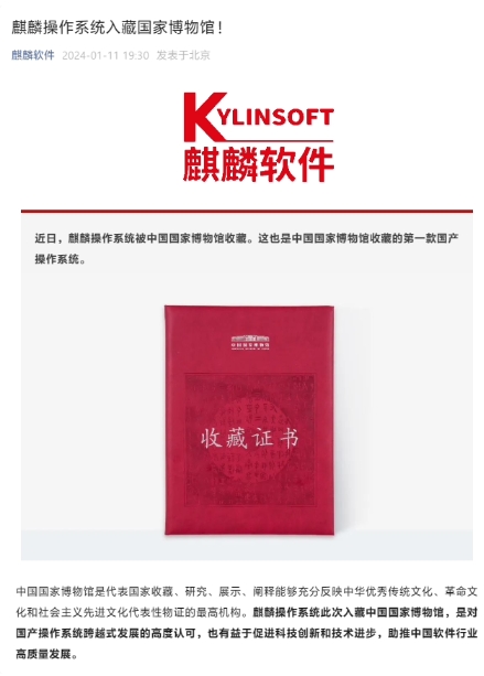 近日麒麟操作系統(tǒng)被中國國家博物館收藏,這也是中國國家博物館收藏的第一款國產(chǎn)操作系統(tǒng)。