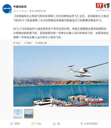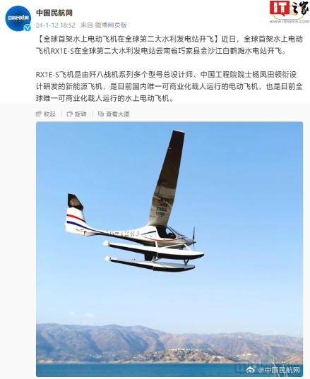 近日,全球首架水上電動飛機 RX1E-S 在全球第二大水利發電站 —— 云南省巧家縣金沙江白鶴灘水電站開飛。