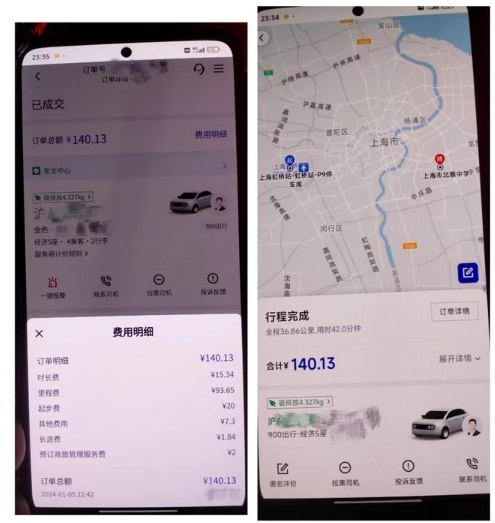 還沒等體驗到所謂的“優惠價”,一次與乘客閑聊中,曹師傅發現,平臺抽傭比例極高,且金額與乘客實付對不上:1 月 5 日 22 時多,他在平臺接到一個從虹橋火車站去往北蔡中學的“大單”,全程 36.86 公里。到達目的地后,他隨口打聽了乘客支付的訂單價才覺不對。“乘客實付 140.13 元,但在平臺的司機端顯示乘客實付 116.92 元,扣完傭金到手只有 86.79 元,抽成比例高達 38%!中間這 20 多元去哪兒了?”
