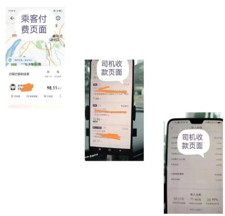 東南大學交通法治與發展研究中心執行主任、中國城市公共交通協會網約車分會會長顧大松曬出的賬單截圖顯示,一位乘客打車,訂單結束實付 98.11 元。但蹊蹺的是,同一段行程,司機端卻顯示乘客付費為 71.46 元,司機實收 52.17 元。中間憑空消失了 26.65 元,超過司機實收的一半。