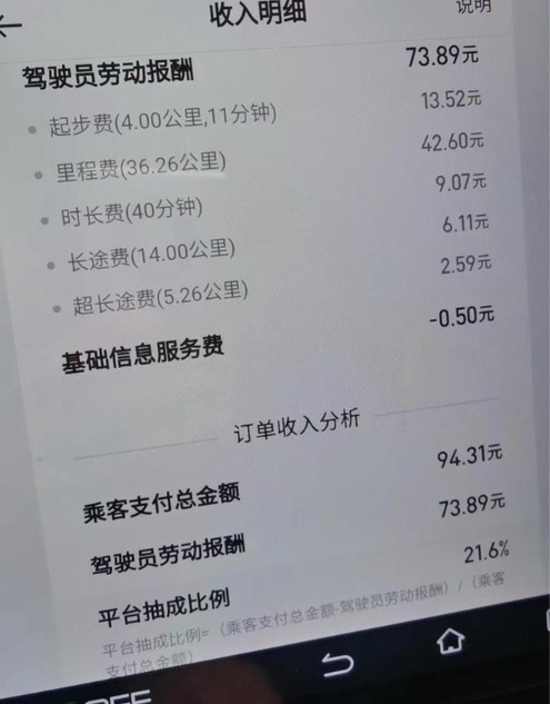 記者在采訪中了解到,有平臺為了吸引客源發放的優惠券,最終也都轉嫁到了司機身上。劉師傅是“曹操出行”的簽約司機,不久前,一個距離 40 公里左右的訂單,抽成后他只收到 73.89 元。“均下來每公里 1.8 元,但平臺顯示抽成比例只有 21.6%。我一問乘客,才知道他領了優惠券,這種低價訂單越來越多,豈不是意味著平臺的折扣最終還是讓司機來承擔?”