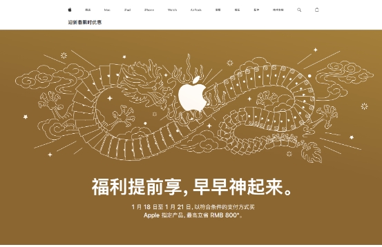 蘋果官網宣布將限時推出“新春優惠”活動:從1月18日至1月21日,以符合條件的支付方式購買包括蘋果指定產品,即可獲得從50元到800元不等的降價優惠。