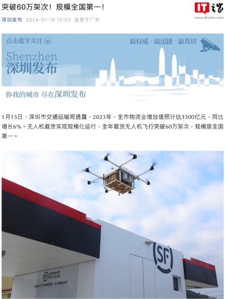據“深圳發布”官方公眾號消息,深圳市交通運輸局昨日透露,2023 年深圳市物流業增加值預計達 3500 億元,同比增長 6%。無人機載貨實現規模化運行,全年載貨無人機飛行突破 60 萬架次,規模居全國第一。