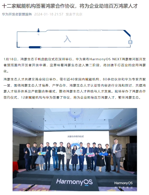 鴻蒙生態千帆啟航儀式今日在深圳舉行,華為宣布 HarmonyOS NEXT 鴻蒙星河版開發者預覽面向開發者開放申請。與此同時,鴻蒙生態人才共建交流會也在同日舉辦。